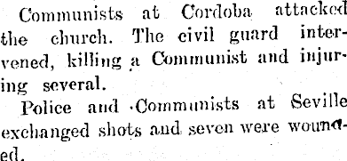 Communists at Cordoba attacked the church. The civil guard intervened, killing a Communist and injuring several. Police and .Communists at Seville exchanged shots and seven were wounded.