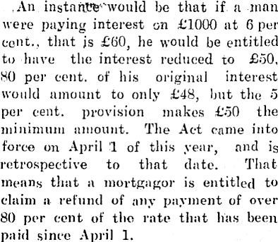 An instahW would be that if a man were paying interest on £IOOO at 6 per cent., that js £OO, he would be entitled to have the interest reduced to £SO, 80 per cent, of his original interest would amount to only £4B, hut the 5 per cent, provision makes £SO the minimum amount. The Act came into force on April 1 of this year, and is retrospective to that date. That means that a mortgagor is entitled to claim a refund of any payment of over 80 per cent of the rate that has been paid since April 1.