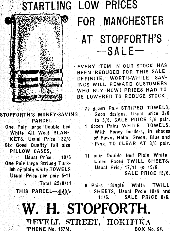 STARTLING LOW PRICES mm, $ V? % i, V/'t FOR MANCHESTER AT STOPFORTH’S -SALEEVERY ITEM IN OUR STOCK HAS BEEN REDUCED FOR THIS SALE. DEFINITE, WORTH-WHILE SAVINGS WILL REWARD CUSTOMERS WHO BUY NOW! PRICES HAD TO BE LOWERED TO REDUCE STOCK. STOPFQRTH’S MONEY-SAVING PARCEL. One Pair large Double bed White All Wool BLANKETS. Usual Price 32/6 Six Good Ouality full size PILLOW CASES, Usual Price 10/6 One Pair large Striped Turkish or plain white TOWELS Usual Price per pair 5-11 Total £2/8/11 2i. dozen Pair STRIPED TOWELS, Good designs. Usual price 3/6 to 5/6. SALE PRICE 3/6 pair. 1 dozen Pairs WHITE TOWELS, With Fancy borders, in shades of Fawn, Hello, Green, Blue and > Pink. TO CLEAR AT 3/6 pair. 11 pair Double Bed Plain White Linen Faced TWILL SHEETS. Usual Price 17/11 to 19/6. SALE PRICE 15/6. THIS PARCEL-40/. 9 Pairs Single White TWILL SHEETS. Usual Prcie 10/6 and 11/6. SALE PRICE 8/6. W. H. STOPFORTH. REVEfX STREET, HOKITIKA ’PHONE No. 167 M. BOX No. 94.