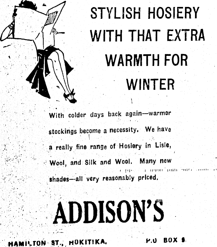 STYLISH HOSIERY 4-r{jj~ WITH THAT EXTRA ' JT\V WARMTH FOR . WINTER With colder days back again—warmer stockings become a necessity. We have a really fine range of Hosiery in Lisle, Wool, and Silk and Wool. Many new I pi’ I 'MI shades—all very reasonably priced. ADDISON’S H AMILTON ST., HOKITIKA. H.O I