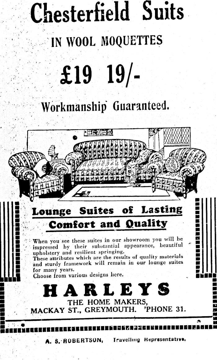 Chesterfield Suits IN WOOL MOQUETTES £l9 19/Workmanship Guaranteed. Lounge Suites Lasting Comfort and Quality ; When you see these suites in our showroom you will he impressed hy their substantial appearance, beautiful upholstery and resilient springing. These attributes which are the results of quality materials and sturdy framework will remain in our lounge suites for many years. Choose from various designs here. HARLEYS THE HOME MAKERS, MACKAY ST., GREYMOUTH. ’PHONE 31. Ml IBBEMSUHI A. $. ROBERTSON, Travelling Representative.