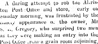 A during attempt to rob too ALriston Post Office and store, early on cunday morning, was frustrated l>y the tunny ajipvnrani'e o. the owner, Mr ,'5. Gregory, who surprised two men as u.ey v.ere making an entry into tile Post Oil.ee .run-a grain room adjoining.