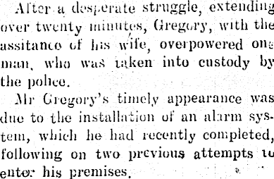 After.a desperate struggle, extending over twenty minutes, Gregory, with the assitanco of ins wife., overpowered otic man, who was taken into custody by the police. Air Gregory’s timely appearance was due to the installation of an alarm system, which lie had recently completed, following on two previous attempts to elite.- his premises.