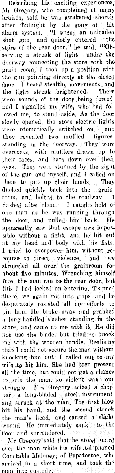 Describing his exciting experiences, Mr Gregory, who complained ef many bruises, said he was awakened shortij after lTiidnight by the gong of his alarm system. “I seized an unloaded shot gun, and quietly entered 'the store of the rear door,” he said. ‘“Observing a .streak bf light undo - .- the doorway connecting the store with the grain room, I took up a position with the gun pointing directly at tho closed door, f heard stealthy movements, and the light streak .brightened. There were Bounds of the door being forced, and I signalled my wife, who had followed me, to stand aside. As the door slowly opened, the sto*re electric lights were utomatically switched on. and they revealed two muffled figures standing in the doorway. They wore overcoats, with mufflers drawn up to their faces, and hats down over their eyes. They were stunned by the sight of the gun and myself, and T called on them to put up their hands. They ducked quickly hack into the grainroom, and bolted to the roadway. I dashed after them. I caught hold of one man as lie was running through the door, and pulled him back. He apparently saw that escape aws impossible without a fight, and he hit out at my head and body with his fists. I tried to overpower him, without recourse to direct violence, and we struggled all over the grainroom for about five minutes. Wrenching himself free, the mah ran to. the rear door, but this I had locked on entering. Ti-apred there, we again got into grips and ho desperately resisted all my efforts to pin him. He broke away and grabbed a long-handled slasher standing-in the store, and came at me with it. He did not use the blade, but tried to knock mo with the wooden handle. Realising that T could not secure the man withoul knocking him out T called out to my wi ’<; To hit him. She had been presenl all the time, but could not get a chance to grip the man. so violent was our struggle. Mrs Gregory seized a chop per, a long-blrtded steel instrument and struck at tho man. The fbst blow bit his hand, and the second struck the man’s head, and caused a slight wound. He immediately sank to the floor and surrendered. Mr Gregory Raid that ho stood guard over the man while Ins wife v tel - phoned Constable Maloney, of Papatoetoe, who arrived in a short time, and took the man into custody.