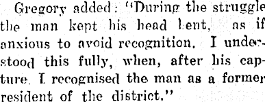 Gregory added “During the struggle the man kept his bead lent. ns if anxious to avoid recognition. I understood this fully, when, after his capture I recognised the man as a former resident of the district.”