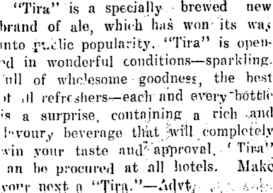 “Tira” is a specially brewed new brand of ale, which has won its way into .fLclic popularity. “Tira” is opened in wonderful conditions—-sparkling, nil of wholesome "goodness, the best d ,(] refreshers—each and every "bottle is a surprise, containing a rich -and hvoury beverage tlliit --Will completely win your taste nnd' : ap'proval. ' Tira” an ho procured at all hotels. Make voi’r next “T'l’iV” —A(|vty ~ ■ *•4'