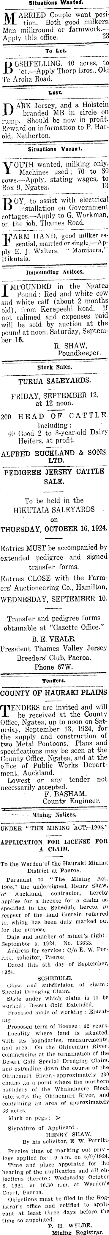 Situation* Wanted, MARRIED Couple want position. Both good milkers. Man milkround or farmwork.--Apply this office. 23 To Let. Bushfelling, 40 acres, to 'et.—Apply Thorp Bros., Old Te Aroha Road. LOSt. DAkK Jersey, and a Holstein branded MB in circle on rump. Should be now in profit. Reward on information to P. Harold, Netherton. Situations Vacant. YOUTH wanted, milking only. Machines used; 70 to 80 cows.—Apply, stating wages, to Box 9, Ngatea. 13 BOY, to assist with electrical installation on Government cottages.—Apply to G. Workman, on the job, Thames Road. 17AKM HAND, good milker essential, married or single. —Apply E. J. Walters, “ Mamiaera,” Hikutaia. Impounding Notices. IMPOUNDED in the Ngatea Pound: Red and white cow and white calf (about 2 months old), from Kerepeehi Road. If not calimed and expenses paid will be sold by auction at the pound at noon, Saturday, September 16. R. SHAW, Poundkeeper. Stock Sales. ~ TURUA SALEYARDS. FRIDAY, SEPTEMBER 12, at 12 noon. 200 HEAD OF CATTLE. Including: 40 Good 2 to 3-year-old DairyHeifers, at profit. ALFRED BUCKLAND & SONS, LTD. PEDIGREE JERSEY CATTLE SALE. To be held in the HIKUTAIA SALEYARDS on THURSDAY, OCTOBER 16, 1924. Entries MUST be accompanied by extended pedigree and signed transfer forms. Entries CLOSE with the Farmers’ Auctioneering Co., Hamilton, WEDNESDAY, SEPTEMBER 10. Transfer and pedigree forms obtainable at “Gazette Office.” B. E. VEALE, President Thames Valley Jersey Breeders’ Club, Paeroa. Phone 67W. Tenffers. COUNTY OF HAURAKI PLAINS TENDERS are invited and will be received at the County Office, Ngatea, up to noon on Saturday, September 13, 1924, for the supply and construction of two Metal Pontoons. Plans and specifications may be seen at the County Office, Ngatea. and at the office of Public Works Department. Auckland. Lowest or any tender not necessarily accepted. F. BASHAM, County Engineer. Mining- Notices. UNDER “THE MINING ACT,-1908.” APPLICATION FOR LICENSE FOR A CLAIM. To the Warden of the Hauraki Mining District at Paeroa. Pursuant to “ The Mining Act, 1908,” the undersigned, Henry Shaw, of Auckland, contractor, hereby aijplies for a license for a claim as specified in the Schedule hereto, in respect of the land therein referred to, which has been duly marked out for the purpose Date and number of miner's right; September 5, 1924. No. 13633. Address for service : C/6 E. W. Porritt, solicitor, Paeroa. Dated this sth day of September, 1924. SCHEDULE. Class and subdivision of claim: Special Dredging Claim. Style under ■syhich claim is to be worked : Desert Gold Extended. Proposed mode of working : Elevating Proposed term of license : 42 years. Locality where land is situated, with its boundaries, measurements, and area : On the Ohinemuri River, commencing at the termination of the Desert Gold Special Dredging Claim, am’ extqnding down the course of the Ohinemuri River,- approximately 230 chains ,tp a point where the northern boundary of the Whakahaere Block intersects the Ohinemuri River, and containing an area of approximately 36 acres. Mark on pegs : > Signature of Applicant: HENRY SHAW, By his solicitor, E. W. PorrittPrecise time of marking out privilege applied for : 9 a.m. on 5/9/1924. Time and place appointed for -he hearing of the application and all objections thereto: Wednesday October 8, 1924, at 10.30 a.m. at Warden’s Court, Paeroa. Objections must be filed in the Registrar’s office and notified to applicant at least three days before the time so appointed. P. H. WYLDE, ' Minins Registrar.