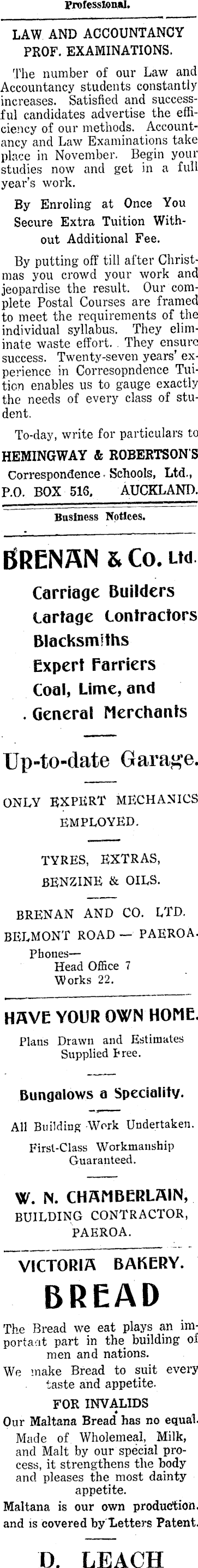Professional. LAW AND ACCOUNTANCY PROF. EXAMINATIONS. The number of our Law and Accountancy students constantly increases. Satisfied and successful candidates advertise the efficiency of our methods. Accountancy and Law Examinations take place in November. Begin your studies now and get in a full year’s work. By Enroling at Once You Secure Extra Tuition Without Additional Fee. By putting off till after Christmas you crowd your work and jeopardise the result. Our complete Postal Courses are framed to meet the requirements of the individual syllabus. They eliminate waste effort. . They ensure success. Twenty-seven years’ experience in Corresopndence Tuition enables us to gauge exactly the needs of every class of student. To-day, write for particulars to HEMINGWAY & ROBERTSON S Correspondence • Schools, Ltd., P.O. BOX 516, AUCKLAND. Business Notices. BRENAN & Co. Ltd. Carriage Builders Cartage Contractors Blacksmiths Expert Farriers Coal, Lime, and . General Merchants Up-to-date Garage. ONLY EXPERT MECHANICS EMPLOYED. TYRES, EXTRAS, BENZINE & OILS. BRENAN AND CO. LTD. BELMONT ROAD — PAEROA. Phones — Head Office 7 Works 22. HAVE YOUR OWN HOME. Plans Drawn and Estimates Supplied Free. Bungalows a Speciality. All Building -Work Undertaken. First-Class Workmanship Guaranteed. W. N. CHAMBERLAIN, BUILDING CONTRACTOR, PAEROA. VICTORIA BAKERY. BREAD The Bread we eat plays an important part in the. building of men and nations. We make Bread to suit every taste and appetite. FOR INVALIDS Our Maltana Bread has no equal. Made of Wholemeal, Milk, and Malt by our special process, it strengthens the body and pleases the most dainty appetite. Maltana is our own production, and is covered by'Letters Patent. D. LEACH