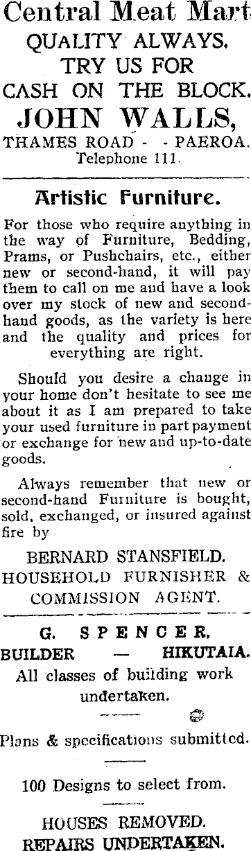 Central Meat Mart QUALITY ALWAYS. TRY US FOR CASH ON THE BLOCK. JOHN WALLS, THAMES ROAD - - PAEROA. Telephone 111. Artistic Furniture. For those who require anything in the way of Furniture, Bedding, Prams, or Pushchairs, etc., either new or second-hand, it will pay them to call on me aud have a look over my stock of new and secondhand goods, as the variety is here and the quality and prices for everything are right. Should you desire a change in your home don’t hesitate to see me about it as I am prepared to take your used furniture in part payment or exchange for hew and up-to-date goods. Always remember that new or second-hand Furniture is bought, sold, exchanged, or insured against fire by BERNARD STANSFIELD. HOUSEHOLD FURNISHER & COMMISSION AGENT. G. SPENCER, BUILDER — HIKUTAIA. All classes of building work undertaken. Plans & specifications submitted. 100 Designs to select from. HOUSES REMOVED. REPAIRS UNDERTAKEN.