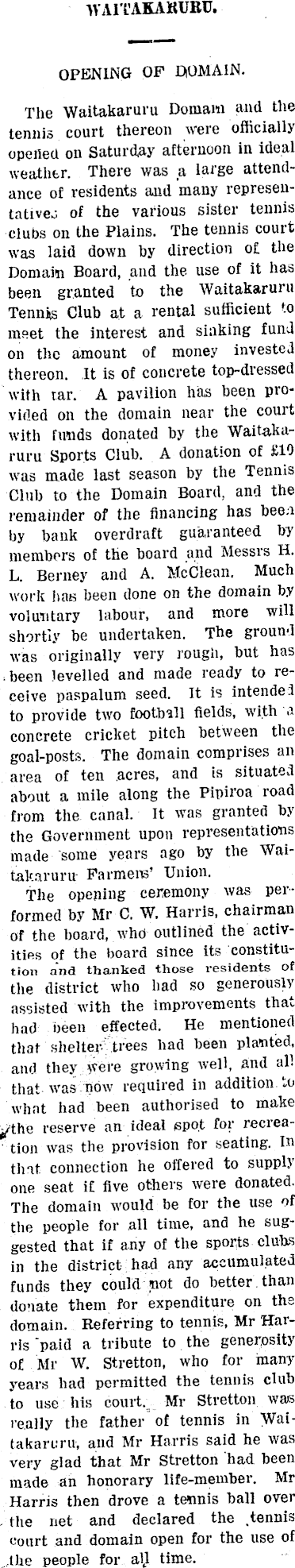 WAITAKAKUBU. OPENING OF POM AIN. The Waitakaruru Domain and the tennis court thereon were officially opened on Saturday afternoon in ideal weather. There was a large attendance of residents and many representatives of the various sister tennis clubs on the Plains. The tennis court was laid down by direction of the Domain Board, and the use of it has been granted to the Waitakaruru Tennis Club at a rental sufficient to meet the interest and sinking fund on the amount of money invested thereon. It is of concrete top-dressed with rar. A pavilion has been provided on the domain near the court with funds donated by the Waitakaruru Sports Club. A donation of £l9 was made last season by the Tennis Club to the Domain Board, and the remainder of the financing has been by bank overdraft guaranteed by members of the board and Messrs H. L. Berney and A. McClean. Much work has been done on the domain by voluntary labour, and more will shortly be undertaken. The ground was originally very rough, but has t been levelled and made ready to receive paspalum seed. It is intended to provide two football fields, with a concrete cricket pitch between the goal-posts. The domain comprises an area of ten acres, and is situated about a mile along the Pipiroa road from the canal. It was granted by the Government upon representations made some years ago by the Waitakaruru- Farmers’ Union. The opening ceremony was performed by Mr C. W. Harris, chairman of the board, whd outlined the activities of the board since its constitution and thanked those residents of the district who had so generously assisted with the improvements that had been effected. He mentioned that shelter trees had been planted, and they were growing well, and all that was how required in addition, m what had been authorised to make vthe reserve an ideal spot for recreation was the provision for seating. In that connection he offered to supply one seat if five others were donated. The domain would be for the use of the people for all time, and he suggested that if any of the sports clubs in the district had any accumulated funds they could not do better, than donate them for expenditure on the domain. Referring to tennis, Mr Harris paid a tribute to the generosity of Mr W. Stretton, who for many years had permitted the tennis club to use his court. Mr Stretton was really the father of tennis in Waitakaruru, and Mr Harris said he was very glad that Mr Stretton had been made ah honorary life-member. Mr Harris then drove a tennis ball over the net and declared the .tennis court and domain open for the use of the people for alj time.