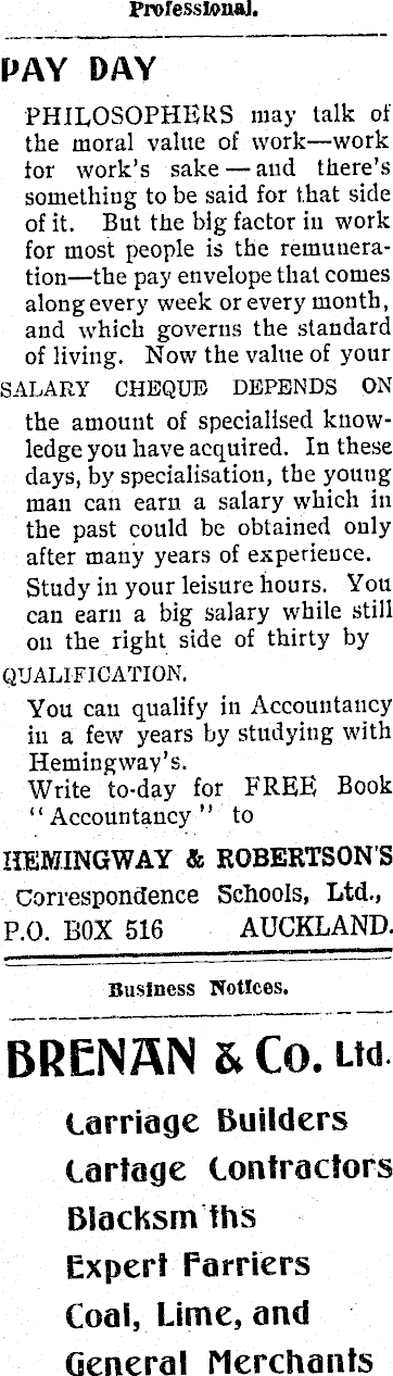 ProfesstonaJ. PAY DAY PHILOSOPHERS may talk of the moral value of work —work tor work’s sake — aud there’s something to be said for that side of it. But the big factor iu work for most people is the remuneration—the pay envelope that comes along every week or every month, and which governs the standard of living. Now the value of your SALARY CHEQUE DEPENDS ON the amount of specialised knowledge you have acquired. In these days, by specialisation, the youug man can earn a salary which in the past could be obtained only after many years of experience. Study in your leisure hours. You can earn a big salary while still on the right side of thirty by QUALIFICATION. You cau qualify in Accountancy in a few years by studying with Hemingway’s. Write to-day for FREE Book “ Accountancy ” to HEMINGWAY & ROBERTSON'S Correspondence Schools, Ltd., P.O. BOX 516 AUCKLAND. Business Notices. BRENAN & Co. tw Carriage Builders Cartage Contractors Blacksm ths Expert Farriers Coal, Lime, and General Merchants