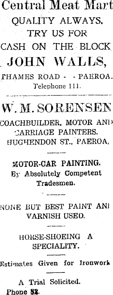 Central Meat Mart QUALITY ALWAYS. TRY US FOR CASH ON THE BLOCK JOHN WALLS, THAMES ROAD - ■ PAEROA. Telephone 111. W. M. SORENSEN COACHBUILDER. MOTOR AND CARRIAGE PAINTERS. HUGHENDON ST., PAEROA, MOTOR-CAR PAINTING. By Absolutely Competent Tradesmen. NONE BUT BEST PAINT ANI VARNISH USED. HORSE-SHOEING A SPECIALITY. Estimates Given for Ironwork A Trial Solicited. Phone 8X-