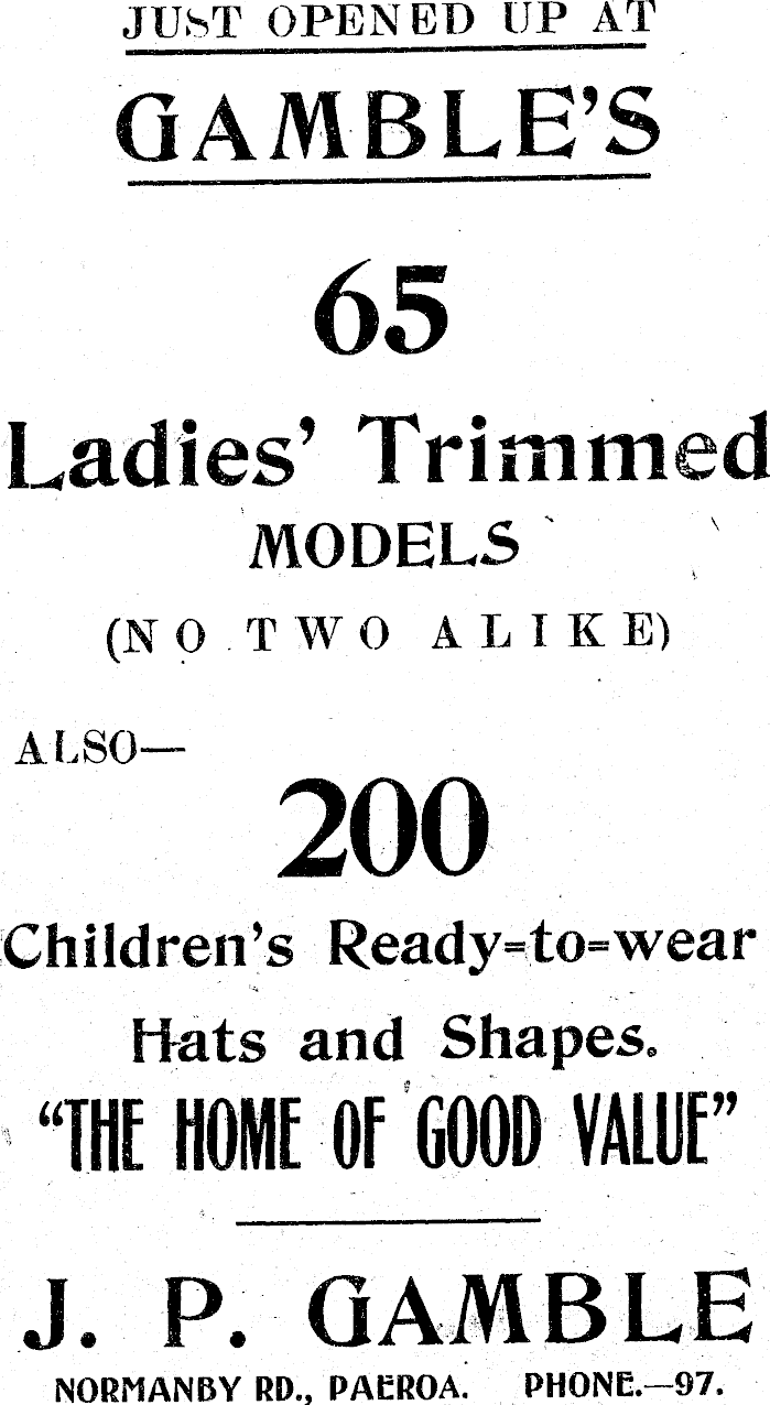 JUST OPENED UP AT GAMBLE’S 65 Ladies’ Trimmed MODELS (N 0 TW 0 ALIKE) ALSO—--200 Children’s Ready-to-wear Hats and Shapes. “THt HOME Of GOOD VALUE” J. P. GAMBLE NORMANBY RD., PAEROA. PHONE—97.