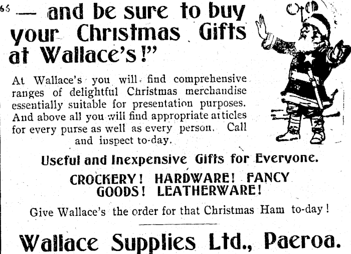 45 — and be sure to buy . c-Mj?.. your Christmas Gifts at Wallace’s At Wallace’s you will, find comprehensive , ranges of delightful Christmas merchandise ; essentially suitable for presentation purposes. , And above all you will find appropriate at tides *| for every purse as well as every person. Call m and inspect to-day. ... Useful and Inexpensive Gifts for Everyone. CROCKERY! HARDWARE! FANCY GOODS! LEATHERWARE! Give Wallace’s the order for that Christmas Ham to-day I Wallace Supplies Ltd., Paeroa.