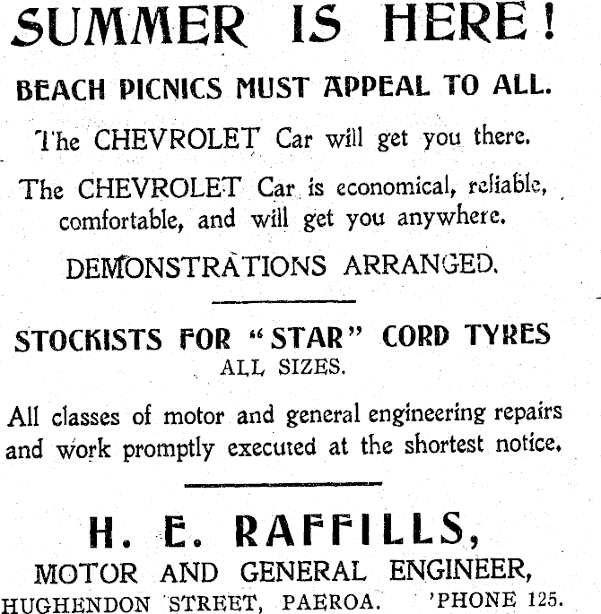 SUMMER IS HERE! BEACH PICNICS MUST APPEAL TO ALL. The CHEVROLET Car will get you there. The CHEVROLET Car is economical, reliable, comfortable, and will get you anywhere. DEMONSTRATIONS ARRANGED. STOCKISTS FOR “STAR” CORD TYRES . all sizes. AU classes of motor and general engineering repairs and work promptly executed at the shortest notice* H. E. RAFFILLS, MOTOR AND GENERAL ENGINEER, HUGHENDON STREET, PAEROA. ’PHONE 125.