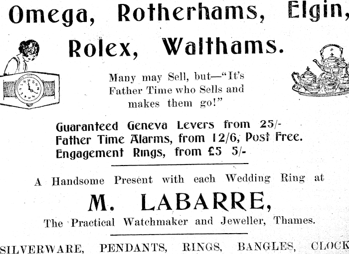 Omega, Rotherhams, Elgin, & Rolex, Waithams. Many may Sell, but —“It’s MjH , Father Time who Sells and makes them go!” Guaranteed Geneva Levers from 25/Fother Time Alarms, from 12/6, Post Free. Engagement Rings, from £5 5/A Handsome Present with each Wedding Ring at M. LABARRE, The Practical Watchmaker and Jeweller, Thames. SILVERWARE, PENDANTS, RINGS, BANGLES, GLOCK