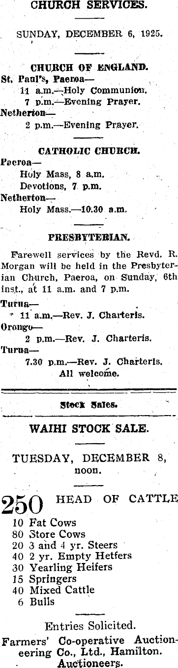 CHURCH SERVICES. SUNDAY, DECEMBER 6, 1925. CHURCH OF ENGLAND. St, Paul’s, Paeroa—--11 a.m.—;Holy Communion. 7 p^m.—Evening Prayer. Nethertoni—--2 p.m.—Evening Prayer. CATHOLIC CHURCH. Pocroa— Holy Mass, 8 a.m. Devotions, 7 p.m. Netherton— Holy Mass. —IG.SO a.m. PRESBYTERIAN. Farewell services by the Revd. R. Morgan will be held in the Presbyterian Church, Paeroa, on Sunday, 6th ins,t., at 11 a.m. and 7 p.m. Turua—- ’ 11 a.m.—Rev. J. Charteris. Oronigo—--2 p.m.—Rev. J. Charteris. Turua—--7.30 p.m.—Rev. J. Charteris. All welcome. Steck Sales. WAIHI STOCK SALE. TUESDAY, DECEMBER 8, noon. ggQ HEAD OF CATTLE 10 Fat Cows 80 Store Cows 20 3 and 4 yr. Steers 40 2 yr. Empty' Hetfers 30 Yearling Heifers 15 Springers 40 Mixed Cattle 6 Bulls Entries Solicited. Farmers’ Co-operative Auctioneering Co., Ltd., Hamilton. Auctioneers.