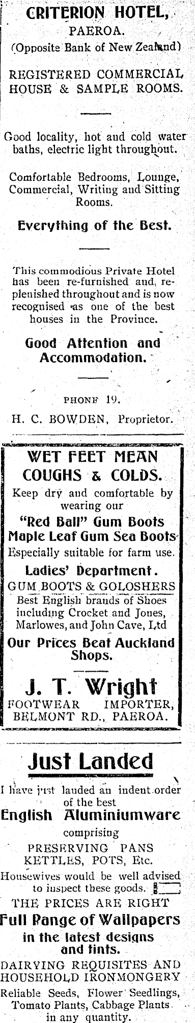 | CRITERION HOTEL, PAEROA. (Opposite Bank of New ZeaMnd) REGISTERED COMMERCIAL HOUSE & SAMPLE ROOMS. Good locality, hot and cold water baths, electric light throughout. Comfortable Bedrooms, Lounge, Commercial, Writing and Sitting Rooms. Everything of the Best. This commodious Private Hotel has been re-furnished and, replenished throughout and is now recognised »as one of the best houses in the Province. Good Attention and Accommodation. PHONE 19. H. C. BOWDEN, Proprietor. ' I WET FEET MEAN COUGHS & COLDS. Keep dry and comfortable by wearing our “Red Ball” Gum Boots Maple Leaf Gum Sea Boots' Especially suitable for farm use. Ladies’ Department. GUM .BOOTS & GOLOSHERS Best English brands of Shoes including Crocket and Jones, Marlowes, and John Cave, Ltd Our Prices Beat Auckland Shops. J. T. Wright FOOTWEAR IMPORTER, BELMONT RD., PAEROA. Just Landed . . ;■ x I have i’ist lauded an indent.order of the best English Aluminiumware comprising PRESERVING PANS KETTLES, POTS, Etc. Housewives would be well advised. ? to inspect these goods. § " ! THE PRICES ARE RIGHT Full Range of Wallpapers in the latest designs and tints. DAIRYING REQUISITES AND HOUSEHOLD IRONMONGERY Reliable Seeds, Flower 'Seedlings, Tomato Plants, Cabbage Plants ■■ in any quantity.