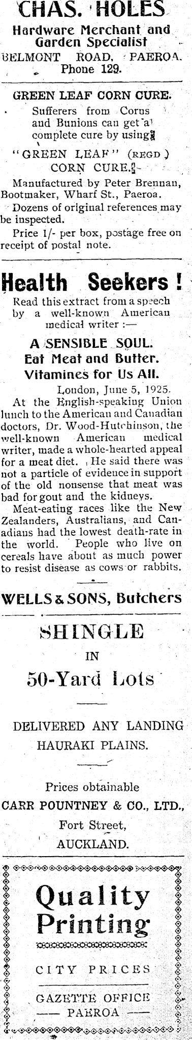CHAS. HOLES Hardware Merchant and Garden Specialist BELMONT ROAD, ■ PAEROA. Phone 129. GREEN LEAF CORN CURE. • Sufferers from. Corus and Bunions can get'a' complete cure by usingg “GREEN LEAF’’ (regd ) CORN CURE.gManufactured by Peter Brennan, Bootmaker, Wharf St., Paeroa. Dozens of original references may be inspected. Price 1/- per box, postage free on receipt of postal note. Health Seekers I Read this extract from a speech by a well-known American medical writer :— A SENSIBLE SOUL. Eat Meat and Butter. Vitamines for Us All. Loudon, June 5, 1925. At the English-speakiug Union lunch to the American and Canadian doctors, Dr. Wood-Hutchinson, the well-known American medical writer, made a whole-hearted appeal for a meat diet. ,He said there was not a particle of evidence in support of the old nonsense that meat was bad for gout and the kidneys. Meat-eating races like the New Zealanders, Australians, and Canadians had the lowest death-rate in the world. ' People who live on cereals have about as much power to resist disease as cows or rabbits. WELLS & SONS, Butchers SHINGLE ' IN 50-Yard Lots DELIVERED ANY LANDING HAURAKI PLAINS. Prices obtainable CARR POUNTNEY & CO., LTD., Fort Street, 1 AUCKLAND. | Quality | I Printing ! | | j CITY PRICES | | | f . GAZETTE OFFICE PAEROA 0
