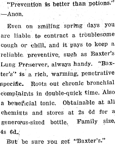 “Prevention is better than potions.’’ —Anon. Even on smiling spring days you are liable to contract a troublesome cough or chill, and it pays to keep a reliable, preventive, such as Baxter’s Lung Preserver, always handy. “Baxter’s” is a rich, warming, penetrative specific. Roots, out chronic bronchial complairds in double-quick time. Also a beneficial tonic. Obtainable at all chemists and stores at 2s 6d for a genenyus-sized bottle. Family size, 4s 6d.. But be sure you get “Baxter’s.”