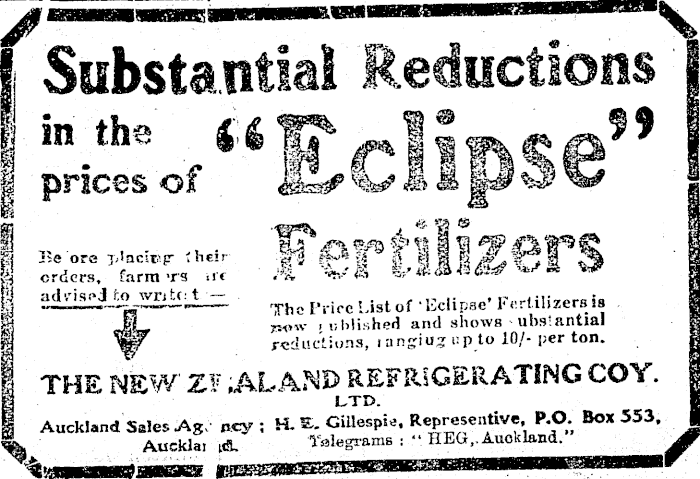 I Substantial Reductions 1 in the I prices of I > ©rollers | | Tfhc Price List of ‘Eclipse’Fertilizers is . I g El ,»(»»,• > übli.shed and shows substantial g | WT eductions, langiuj up to 10/- per ton. g I THE NEW ZV ,ALAN£> REFRIGERATING COY. | g LTD. ■ | Auckland Sales Ag. ncy ;H. Gillespie, Representive, P.O. Box 553, ■ % Aucklai id. Telegrams : “ BEG,. Auckland. J