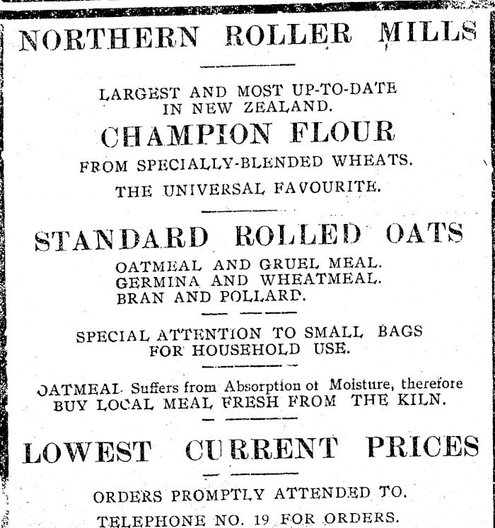 llli |[ l lllll ll 'll llll " llltMtlllrT^'~: ''^ ? ~ | NORTHERN ROLLER MILLS LARGEST AND MOST UP-TO-DATE IN NEW ZEALAND. CHAMPION FLOUR FROM SPECIALLY-BLENDED WHEATS. \ THE UNIVERSAL FAVOURITE. STANDARD ROLLED OATS OATMEAL AND GRUEL MEAL. GERMTNA AND WHEATMEAL. BRAN AND POLLARD. SPECIAL ATTENTION TO SMALL BAGS FOR' HOUSEHOLD USE. OATMEAL Suffers from Absorption oi Moisture, therefore BUY LOCAL MEAL FRESH FROM THE KILN. LOWEST CURRENT PRICES •. ORDERS PROMPTLY ATTENDED TO. j TELEPHONE NO. 19 FOR ORDERS.