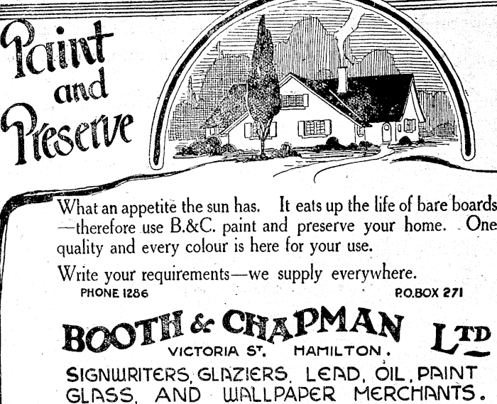 and What an appetite the sun has. It eats up the life of bare boards « —therefore use B.&C. paint and preserve your home. One I quality and every colour is here for your use. Write your requirements—we supply everywhere. PHONE 1266 R0.80X271 Boo’ll & AhJ rtd *-®V* r *' VICTORIA S T . HAMILTON . SIGNIURITCRS, GLKZISRS. L€l>D. OIL.PP6NT GLOSS. AND IUM-LPAPeR MGRCMONTS.