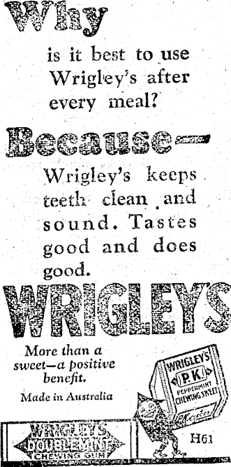 Why ' is it best to use Wrigley’s after every meal? Wrigley’s keeps teeth clean . and sound. Tastes good and does good. WRISETS More them a sweet—a positive benefit. Made in Australia