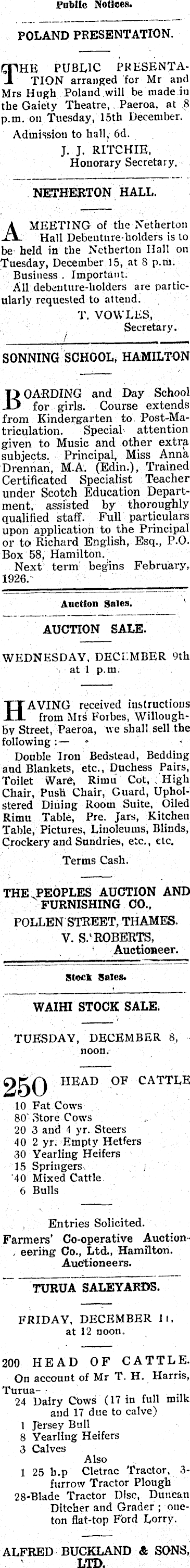 Public Notices. POLAND PRESENTATION. The public presentation arranged for Mr and Mrs Hugh Poland will be made in the Gaiety Theatre,. Paeroa, at .8 p.m. on Tuesday, 15th December. Admission to hall, 6d. J. J. RITCHIE, Honorary Secretary. , NETHERTON HALL. A MEETING of the Netherton A. Hall Debenture-holders is to be held in the Netherton Hall on Tuesday, December 15, at 8 p.m. Business . Important. All debenture-holders are particularly requested to attend. T. VOWLES, Secretary. ' / / SUNNING SCHOOL, HAMILTON BOARDING and Day School for girls. Course extends from Kindergarten to Post-Ma-triculation. Special attention given to Music and other extra subjects. Principal, Miss Anna Drennan, M.A. (Edin.), Trained Certificated Specialist Teacher under Scotch Education Department, assisted by thoroughly qualified staff. Full particulars upon application to the Principal or to Richard English, Esq., P.O. Box 58, Hamilton/ Next term’ begins February, 1926. • 1 Auction Sales. ' AUCTION SALE. WEDNESDAY, DECEMBER 9th . at 1 p.m. HAVING received instructions from Mrs Forbes, Willoughby Street, Paeroa, we shall sell the following : — • Double Iron Bedstead, Bedding and Blankets, etc., Duchess Pairs, Toilet Ware-, Rimu Cot, . High Chair, Push Chair, Guard, Upholstered Diuing Room Suite, Oiled Rimu Table, Pre. Jars, Kitchen Table, Pictures, Linoleums, Blinds, Crockery and Sundries, etc., etc. Terms Cash. THE PEOPLES AUCTION AND FURNISHING CO., POLLEN STREET, THAMES. V. S? ROBERTS, Auctioneer. Stock Sales. WAIHI STOCK SALE. TUESDAY, DECEMBER 8, noon. 250 HEAD 0F CATTLE 10 Fat Cows 80' Store Cows 20 3 and 4 yr. Steers 40 2 yr. Empty Hetfers 30 Yearling Heifers 15 Springers. ’4O Mixed Cattle 6 Bulls Entries Solicited. Farmers’ Co-operative Auction- , eering Co., Ltd., Hamilton. Auctioneers. TURUA SALEYARDS. FRIDAY, DECEMBER It. at 12 noon. 200 HEAD OF CATTLE. On account of Mr T. H. Harris, Turua- • 24 Dairy Cows (17 in full milk and 17 due to calve) 1 Jersey Bull 8 Yearling Heifers 3 Calves Also 1 25 b.p Cletrac Tractor, 3furrow Tractor Plough 28-Blade Tractor Disc, Duncan Ditcher and Grader ; oneton flat-top Fbrd Lorry. ALFRED BUCKLAND & SONS, LTD.