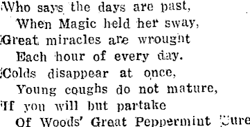 •Who says, the days are past, When Magic held her sway, .Great miracles are wrought Each hour of every day. ■Colds disappear at once, Young coughs do not mature, 'lf yon will but partake Of Woods’ Great Peppermint 'Jure.