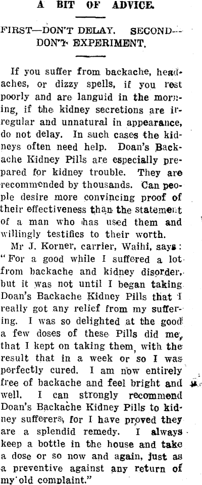 A BIT OF ADVICE. FIRST—DON’T DELAY. SECOND—DON”b EXPERIMENT. If you suffer from backache, headaches, or dizzy spells, if you rest poorly and are languid in the morning, if the kidney secretions are irregular and unnatural in appearance, do not delay. In such cases the kidneys often need help. Doan’s Backache Kidney Pills are especially prepared for kidney trouble. They are recommended by thousands. Can people desire more convincing proof of their effectiveness than the statement of a man who has used them and willingly testifies to their worth. Mr J. Korner, carrier, Waihi, says: “For a good while I suffered a lot from backache and kidney disorder, but it was not until I began taking Doan’s Backache Kidney Pills that I really got any relief from my suffering. I was so delighted at the good 1 a few doses of these Pills did me; that I kept on taking them, with the result that in a week or so I was perfectly cured. lam nbw entirely . free of backache and feel bright and well. I can strongly recommend Doan’s Backache Kidney Pills to kidney sufferers,, for I have proved they are a splendid remedy. I always • keep a bottle in the house and take ( a dose or so now and again, just as a preventive against any return of my - old complaint.”