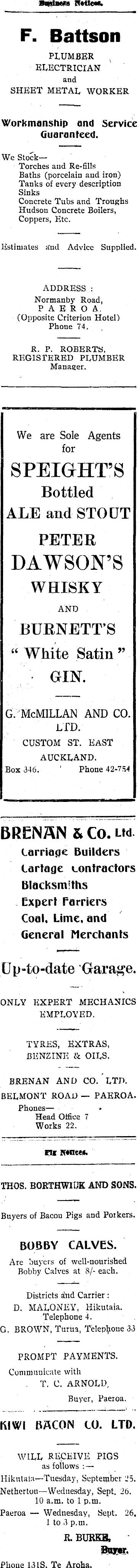 F. Battson PLUMBER ELECTRICIAN and SHEET METAL WORKER Workmanship and Service Guaranteed. We StockTorches and Re-fills Baths (porcelain and iron) Tanks of every description Sinks Concrete Tubs and Troughs Hudson Concrete Boilers, Coppers, Etc. Estimates and Advice Supplied. ADDRESS : Normanby Road, PAEROA. (Opposite Criterion Hotel) Phone 74. R. P. ROBERTS. REGISTERED PLUMBER Manager. We are Sole Agents for SPEIGHT’S Bottled ALE and STOUT PETER DAWSON’S WHISKY AND BURNETT’S 66 White Satin ” GIN. g. McMillan and co. ltd. CUSTOM ST. EAST AUCKLAND. Box 346. ' Phone 42-754 BRENAN & Co. lm Carriage Builders Cartage contractors Blacksmiths Expert Farriers Coal. Lime, and General Merchants Up-to-date Garage. ONLY EXPERT MECHANICS EMPLOYED. TYRES, EXTRAS, BENZINE & OILS. BRENAN AND CO. LTD. BELMONT ROAD — PAEROA. Phones — Head Office 7 Works 22. Ftt N<ncM. THOS. BORTHWIDK AND SONS. Buyers of Bacon Pigs and Porkers. BOBBY CALVES. Are buyers of well-nourished Bobby Calves at 8/- each. Districts and Carrier: D. MALONEY, Hikutaia. Telephone 4. G. BROWN, Turua, Telephone 33 PROMPT PAYMENTS. Communicate with . T. C. ARNOLD, Buyer, Paeroa. KIWI BACON CO. LTD. WILL RECEIVE PIGS as follows : — Hikutaia —Tuesday, September 25. Netherton —Wednesday, Sept. 26. 10 a.m. to 1 p.m. Paeroa — Wednesday, Sept. 26. 1 to 3 p.m. R. BURKE, Buyer. Phone 13IS, Te Arolia.