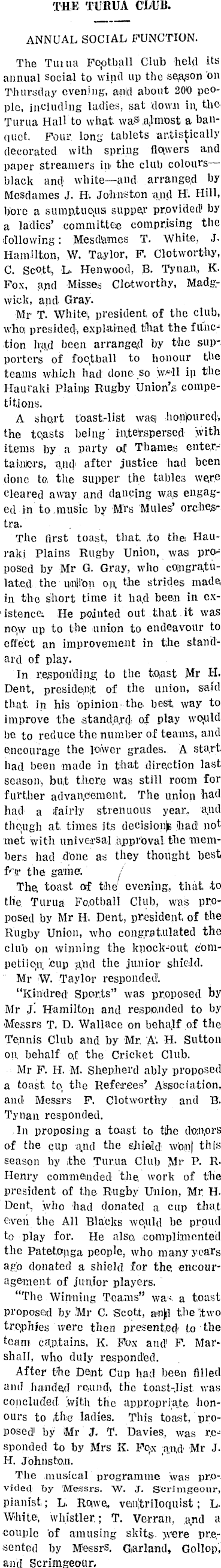 THE TURUA CLUB. ANNUAL SOCIAL FUNCTION. The Tuiua Fcpt.ball Club held its annual social to wind up the season on Thursday evening, anid about 20*0 people, including ladies, sat down in, the Turua Hall to what wa.» almost a banquet. Four, long tablets artistically decorated with spring flqwers and paper streamers in the club colours — black and; white—and arranged by Mesdames J. H. Johnston and H. Hill, bore a sump.tuqusi supper provided 1 by a ladies’ committee comprising the following: Mesdames T. White, J. Hamilton, W. Taylor, F. Clotworthy, C. Scott, L. Henwood, B. Tynan, K. Fox, ajid Misses Clotworthy, Madgwick, and Gray. Mr T. White, president of the club, who, presided, explained that the function had been arranged by the sup-, porters of football to honour the teams which had: done-so well ip the Hauraki Plainjs Rugby Union’s competitions. A short toast-list was) hon]oured> the toasts being interspersed with items by a party of Thames entertainers, anil after justice had been done to. the supper the tables were cleared away and dancing was engaged in to.music by Mi’s Mules’ orchestra. The first toast, that. ,to the Hauraki Plains Rugby Union, was proposed by Mr G. Gray, who congratulated the unli’on on, the strides made in the short time it had been in existence. He pointed out that it was nc*w up to the union to endeavour to effect an improvement in the standard of play. In responding to the toast Mr H. Dent, presidepit of the union, said that in his opinion -the- best, way to improve the standard of play wquld be to reduce the number of teams, and encourage the lower grades. A sta.rt had been made in that direction last season, but there was still room for further advancement. The union had had a fairly strenuous year, and though at. times its had not met with universal approval the members had done as they thought best f' r ir the game. f The toast of the evening, that to the Turua Football Club, was proposed by Mr H. Dent, president of the Rugby Union, who congratulated the club on winning the knock-out, c’ompetiieju, ■cup a,nd the junior shield. Mr W. Taylor responded. “Kindred Sports” was proposed by Mr Ji Hamilton and responded to by •Messrs T. D. Wallace on behajf of the Tennis Club and by Mr. A‘. H. Sutton on. behalf of the Cricket Club. Mr F. H. M. Shepherd ably proposed a toast, to the Referees’ Association, and Messrs F. Clotworthy and B. Tynan responded. In proposing a toast to the donors of the cup nnd the shield Woin| this season by the Turua Club Mr P. RHenry commended the work of the president of the- Rugby Union, Mr H. Dent, who had donated a cup that even the All Blacks wquld be proud to play for. He also, complimented the Patetonga people, who many years agb donated a shield for the encouragement of junior players. “The Winning Teams” wa«- a toast proposed by Mr C. Scott, aujd t, he it wo trophies were then presented to the team captains, K. Fox and 1 F. Marshall, who duly responded. After the Dent Cup had been filled and handed rqund, the toast-list, was concluded with the appropriate honours to th© ladies. This toast, proposedl by Mr J. T. Davies, was responded to by Mrs K. Fc.x and Mr J. H. Jbhnston. The musical programme was provided by Messrs. W. J. Scrimgeour, pianist; L. Rqwe„ ventriloquist; L. White, whistler,; T. Verran, .and a couple of amusing skits-, yore presented by Messrs. Garland, Gollop', and Scrimgeour,
