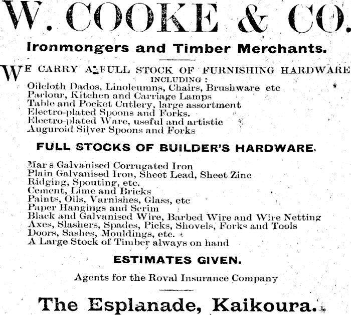 W. COOK E & CO. Irontnong'ers and Timber Merchants. WE CARRY STOCK OF FURNISHING HARDWARE INCLUDING : Oilcloth Dados, Linoleumns, Chairs, Brushware etc Parlour, Kitchen and Carriage Lamps Table and Pocket Cutlery, large assortment Electro-plated Spoons and Forks. Electro-plated AV are, useful and artistic Auguroid Silver Spoons ami Forks FULL STOCKS OF BUILDER’S HARDWARE. Mar s Galvanised Corrugated Iron Plain Galvanised Iron, Sheet Lead, Sheet Zinc Ridging, Spouting, etc. Cement, Lime and Bricks Paints, Oils, Varnishes, Glass, etc Paper Hangings and Scrim Black and Galvanised Wire, Barbed Wire and Wire Netting Axes, Slashers, Spades, Picks, Shovels, Forks and Tools Doors, Sashes, Mouldings, etc. A Large Stock of Timber always on hand ESTIMATES GIVEN. Agents for the Roval Insurance Company The Esplanade, Kaikoura.