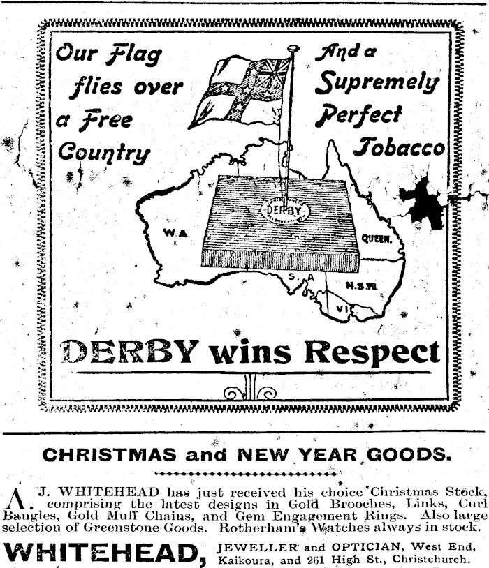 | Our flag a | flies over US& Supremely | .. | a free Perfect | j Qourjtry A Tobacco I fUSfewL' Ul- 1.! -. i \ W A QBPh\ 5 I• \ I \J) I N.SJI J < g “Ksv / s I I | DERBY wins Respect | | PN l/c) I CHRISTMAS and NEW YEAR GOODS. A J. WHITEHEAD has just received his choice‘Christmas Stock, . comprising the latest designs in Gold Brooches, Links, Curl Bangles, Gold Muff Chains, and Gem Engagement Rings. Also large selection of Greenstone Goods. Rotherham’s Watches always in stock. WHITFHf* AH JEWELLER and OPTICIAN, West End, Ww BH I I Eml Kaikoura, and 261 High St., Christchurch.
