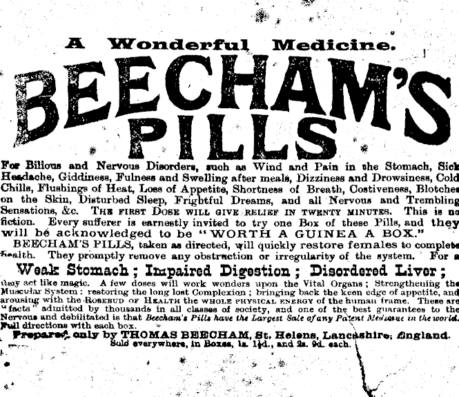A W onderful Medicine. 3 E £WS Foe Bilious and Nervous Disorders, such as Wind and Pain in she Stomach, Sick Headache, Giddiness, Fulness and Swelling after meals, Dizziness and Drowsiness, Cold Chills, Flushings of Heat, Loes of Appetite, Shortness of Breath, Costiveness, Blotches on the Skin, Disturbed Sleep, Frightful Dreams, and all Nervous and Trembling Sensations, &c. Thk first Dore will give relief in twenty minutes. This is no fiction. Every sufferer is earnestly invited to try one Box of these Pills, and they will be acknowledged to be “WORTH A GUINEA A BOX.” BEECHAM’S PILLS, taken as directed, tyill quickly restore females to complete "•alth. They promptly remove any obstruction or irregularity of the system. For a Weak Stomach; Impaired Digestion; Disordered Liver; act like magic. A few doses will work wonders upon the Vital Organs ; Strengthening the Muscular System : restoring the long lost Complexion ; bringing back the keen edge of appetite, and arousing with the Rosebud of Health the whole physical energy of the human frame. These are '■‘facts” admitted by thousands in all classes of society, and one of the best guarantees to the Nervous and debilitated is that Beecham’s Pills have the Largest Sale of any Patent Medium in the world. Full directions with each box. by THOMAS BHHCHAM. St. Helens, Lancashire, jfingland. ~ Sold «verywhu«, in 80x... U. Hd.> 2«. M.. uch. I \