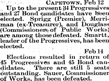 Capetown, Feb 12 Up to the present 34 Progressives and 27 Bond candidates have bfeen elected. Sprigg (Premier), Merriman (ex-Treasurer), and Douglass (Commissioners of Public Works) are among those defeated. Smartt, leader of the Progressives, has been elected. Feb 14 Elections resulted in return of 45 Progressives and 45 Bond candidates. There are still 5 seats outstanding. Sauer, Commissioner of Works, has been defeated.