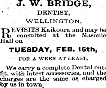 J. W. BRIDGE, DENTIST, WELLINGTON, REVISITS Kaikoura and may be consulted at the Masonic Hall on TUESDAY, FEB. 16th, FOR A WEEK AT LEAST, We carry a complete Dental outfit, with latest accessories, and the charges are the same as charged by us in town.