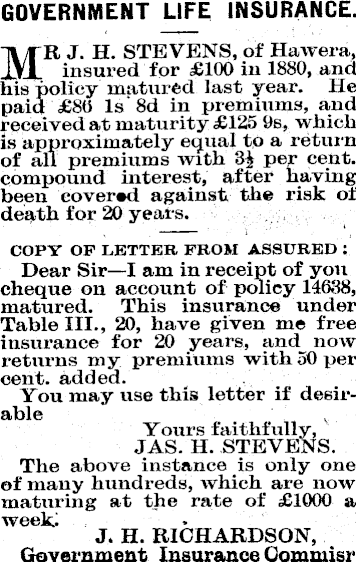 GOVERNMENT LIFE INSURANCE. MR J. H. STEVENS, of Hawera, insured for £lOO in 1880, and his policy matured last year. He paid £BO Is 8d in premiums, and received at maturity £125 9s, which is approximately equal to a return of all premiums with 3| per cent, compound interest, after having been covered against the risk of death for 20 years. COPY OF LETTER FROM ASSURED : Dear Sir—l am in receipt of you cheque on account of policy 14638, matured. This insurance under Table 111., 20, have given me free insurance for 20 years, and now returns my premiums with 50 per cent, added. You may use this letter if desirable Yours faithfully, JAS. H. STEVENS. The above instance is only one of many hundreds, which are now maturing at the rate of £lOOO a week. J. H. RICHARDSON, Government Insurance Gommisr