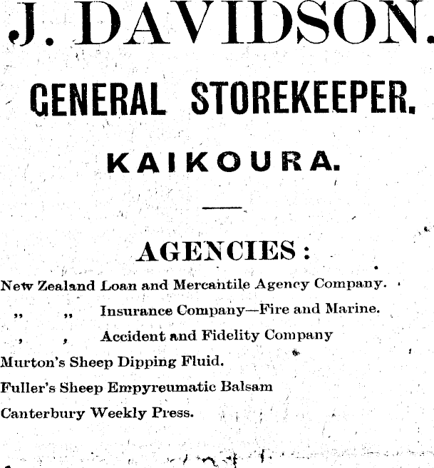 J. DAVIDSON. GENERAL STOREKEEPER. KAIKOURA. AGENCIES: New Zealand Loan and Mercantile Agency Company. • ~ ~ Insurance Company —Fire and Marine. , , Accident and Fidelity Company Murton’s Sheep Dipping Fluid. Fuller’s Sheep Empyreumatic Balsam Canterbury Weekly Press. ■ . <• •