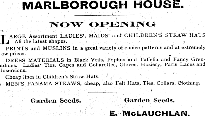 MARLBOROUGH HOUSE. NOW OPENING LARGE Assortment LADIES’, MAIDS’ and CHILDREN’S STRAW HAIS All the latest shapes. PRINTS and MUSLINS in a great variety of choice patterns and at extremely ow prices. . T DRESS MATERIALS in Black Voils, Poplins and Taffella and Fancy Grenadines. Ladies’ Ties. Capes and Collarettes, Gloves, Hosiery, Paris Laces and Insersions. Cheap lines in Children’s Straw Hats. MEN’S PANAMA STRAWS, cheap, also Felt Hats, Ties, Collars, Clothing. Garden Seeds. Garden Seeds. E. McLAUCHLAN.