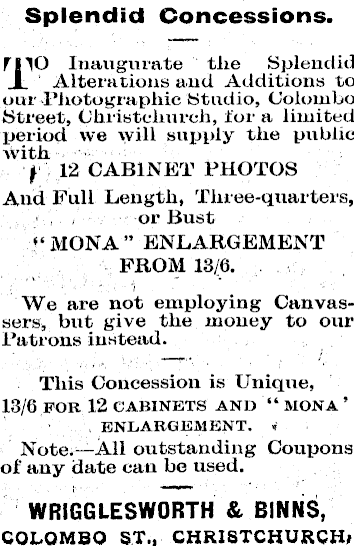 Splendid Concessions. FilO Inaugurate the Splendid I Alterations and Additions to our Photographic Studio, Colombo Street, Christchurch, for a limited period we will supply the public with ? 12 CABINET PHOTOS And Full Length, Three-quarters, or Bust “MONA”ENLARGEMENT FROM 13/6. We are not employing Canvassers, but give the money to our Patrons instead. This Concession is Unique, 13/6 FOR 12 CABINETS AND “ MONA ’ ENLARGEMENT. Note.—All outstanding Coupons of any date can be used. WRIGGLESWORTH & BINNS, COLOMBO ST., CHRISTCHURCHi