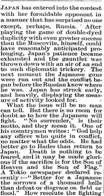 Japan has entered into the contest with her formidable opponent in a manner that has surprised no one except, perhaps, Russia. After playing the game of double-dyed duplicity with even greater success than the Muscovite, himself, could have reasonably anticipated prolonging, Japan’s patience became exhausted and the gauntlet was thrown down with an air of an end to such diplomatic trickery. The next moment the Japanese guns were run out and the conflict began before the Russian knew where he was. Japan has struck early, and heavily, displaying the measure of activity looked for. What the issue will be no man can tell. But there is no room for doubt as to how the Japanese will fight. “No surrender,” is their motto, and they mean it. One of his countrymen writes : “ God help any officer who quits in conflict, no matter what the odds. He had better go to Hades than return to Japan. Death is nothing to be feared, and it may be made glorious if the sacrifice is for the Son of Heaven and the Sun of Flag.” A Tokio newspaper declared recently : —“ Better for a Japanese the sorrows of a thousand hells than defeat or disgrace on field or flood.” How resolute the fighting