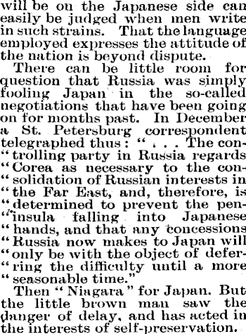 will be on the Japanese side can easily be judged when men write in such strains. That the language employed expresses the attitude of the nation is beyond dispute. There can be little room for question that Russia was simply fooling Japan in the so-called negotiations that have been going on for months past. In December a St. Petersburg correspondent telegraphed thus : “ . . . The con- “ trolling party in Russia regards “Corea as necessary to the con- “ solidation of Russian interests in “the Far East, and, therefore, is to prevent the peninsula falling into Japanese “ hands, and that any concessions “Russia now makes to Japan will “only be with the object of defer- “ ring the difficulty until a more “ seasonable time.” Then “ Niagara” for Japan. But the little brown man saw the danger of delay, and has acted in the interests of self-preservation.