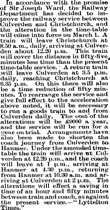 In accordance with the promise of Sir Joseph Ward, the Railway Department has decided to improve the railway service between Culverden and Christchurch, and the alteration in the time-table will co'me into force on March 1. A train will leave Christchurch at 8.50 a.m., daily, arriving at Culverden about 12.20 p.m. This train will cover the distance in fifty-five minutes less time than the present time-table service. A return train will leave Culverden at 3.5 p.m. daily, reaching Christchurch at 6.35 p.m. On this there will also be a time reduction of fifty minutes. To rearrange the service and give full effect to the acceleration above noted, it will be necessary to run a goods trqin to and from Culverden daily. The cost "of the alterations will be £9OOO a year, and the service will be run for a year on trial. Arrangements have also been made to shorten the coach journey from Culverden to Hanmer. Under the amended timutable the train will arrive at Culverden at 12.20 p.m., and the coach will leave at 1 p.m., arriving at Hanmer at 4.30 p.m., returning from Hanmer at 10.30 a.m. and arriving at Culverden at 2 p.m. The alterations will effect a saving in time of an hour and fifty minutes between train and coach, as against the present service.—“ Lyttelton Times.”