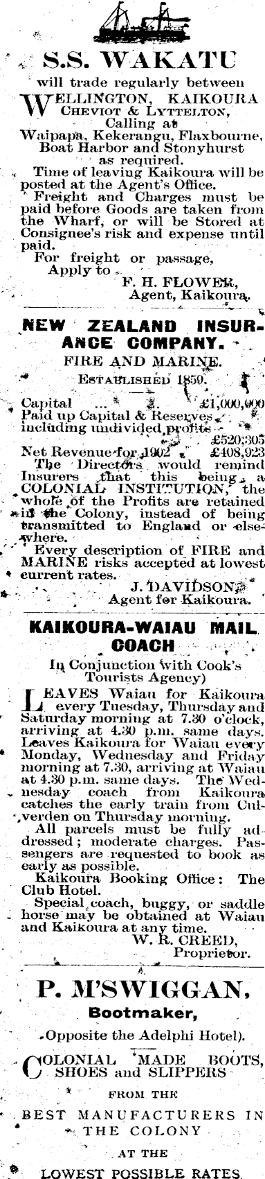 S.S. will trade regularly between WELLINGTON, KAIKOURA Cheviot <fc Lyttelton, Calling at Waipapa, Kekerangu, Flaxbourne, Boat Harbor ana Stonyhurst as required. Time of leaving Kaikoura will be posted at the Agent’s Office. Freight and Charges must be paid before Goods are taken from the Wharf, or will be Stored at Consignee’s risk and expense until paid. For freight or passage. Apply to F. H. FLOWER, Agent, KaikouraNEW ZEALAND INSURANCE COMPANY. FIRE AND MARINE. Established Capital ... ... £1,000,990 Paid up Capital & Reserves. including undivided profits ' * > £520,305 Net Revenue-for J 902 £408,923 The Directors would remind Insurers that this being , a COLONIAL INSTITUTION, the whole of the Profits are retained id the Colony, instead of being transmitted to England or elsewhere. » Everjr description of FIRE and MARINE risks accepted at lowest current rates. J. DA VIDSON, Agent for Kaikoura. KAIKOURA-WAIAU MAIL COACH In Conjunction with Cook’s Tourists Agency) X EAVES Waiau for Kaikoura J every Tuesday, Thursday and Saturday morning at 7.30 o’clock, arriving at 4.30 p.m. same days. Leaves Kaikoura for Waiau every Monday, Wednesday and Friday morning at 7.30, arriving at Waiau at 4.30 p.m. same days. The Wednesday coach from Kaikoura catches the early train from Culverden on Thursday morning. All parcels must be fully ad dressed ; moderate charges. Passengers are requested to book as early as possible. Kaikoura Booking Office : The Club Hotel. Special coach, buggy, or saddle horse may be obtained at Waiau and Kaikoura at any time. W. R. CREED, Proprietor. P. MSWIGGAN, Bootmaker, Opposite the Adelphi Hotel). COLONIAL MADE BOOTS, SHOES and SLIPPERS FROM THE BEST MANUFACTURERS IN THE COLONY AT THE LOWEST POSSIBLE RATES