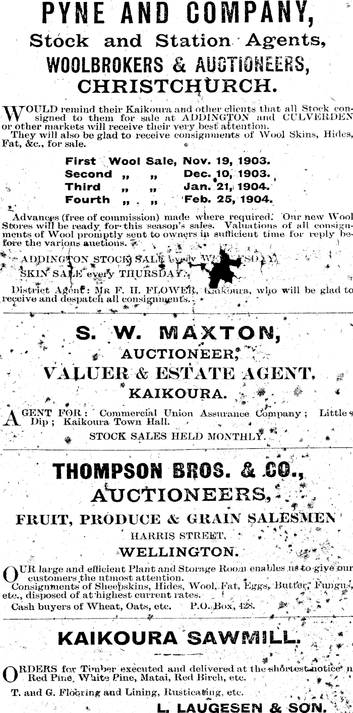 PYNE AND COMPANY, Stock and Station Agents, WOOLBROKERS & AUGTiOHEERS, CHRISTCHURCH. WOULD remind their Kaikoura and other clients that nil Stock consigned to them for sale at ADDINGTON and CULVERDEN or other markets will receive their very best attention. They will also be glad to receive consignments of Wool Skins, Hides, Fat, &c., for sale. First Wool Sale, Nov. 19, 1903. Second „ „ Dec. *lO, 1903. Third „ „ Jan. *21,; 1904-. Fourth ~ ~ Feb. 25, 1904-. Advances (free of commission) made where required. Our new Wool Stores will be ready for-this season’s sales. Valuations of all consignments of Wool promptly sent to owners in sufficient time for reply before the various auctions. A DDINGTON S'ALE 1 ‘ ‘ kKIN SALE'every THURSDA District Agent: Mr F. 11. FLOWEffr,, who will be glad to , receive and despatch all consignments. ■ S- W. MAXTON, AUCTIONEER, VALUER & ESTATE AGENT, KAIKOURA. AGENT FOR : Commercial Union Assurance Company ; Little s Dip ; Kaikoura Town Hall. , STOCK SALES HELD MONTHLf. * THOMPSON BROS. & GO., Auctioneers, FRUIT, PRODUCE & GRAIN SALESMEN HARRIS STREET, WELLINGTON. OUR large and efficient Plant and Storage Room enables us to give our customers the utmost attention. Consignments of Sheepskins, Hides, Wool, Fat, Eggs, Butter, Fungus, etc., disposed of at highest current rates. ' Cash buyers of Wheat, Oats, etc. P.O. Box, 428. KAIKOURA SAWMILL. ORDERS for Timber executed and delivered at the shdrtestmotice n Red Pine, White Pine, Matai, Red Birch, etc. T. and G. Flooring and Lining, Rusticating, etc. L. LAUGESEN & SON.