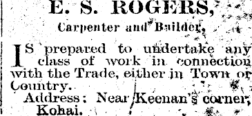 E. S. ROGERS, Carpenter and’Builder, IS prepared to undertake any class of work in connection with the Trade, either in Town or Country. i Address; Near/Keenan’s corner, Kohai.
