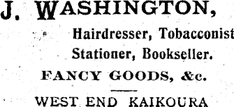 J, WASHINGTON, Hairdresser, Tobacconist Stationer, Bookseller. FANCY GOODS, &c. WEST END KAIKOURA