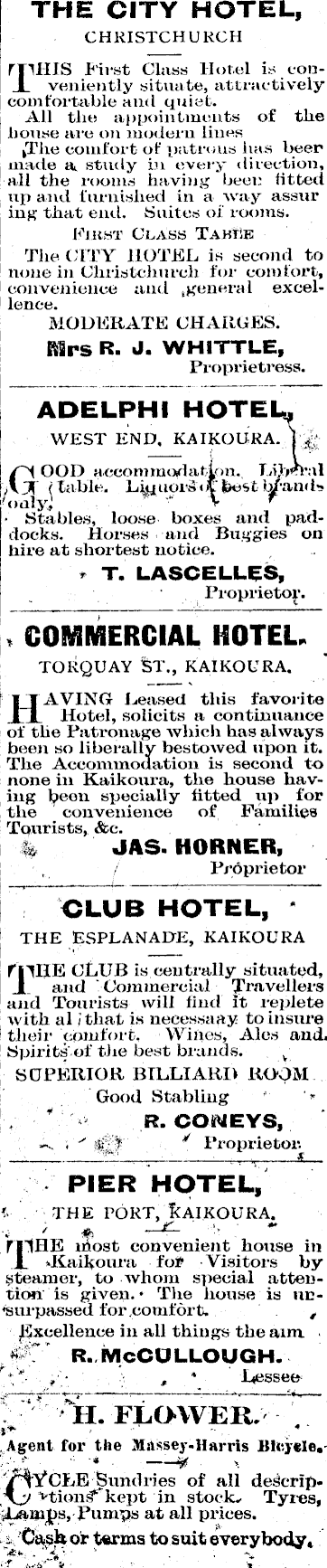 THE CITY HOTEL, CHRISTCHURCH rpHIS First Class Hotel is conI veniently situate, attractively comfortable and quiet. AU the appointments of the house are on modern lines k The comfort of patrons has beer made a study in every direction, all the rooms having beer fitted up and furnished in a way assur ing that end. Suites of rooms. First Class Table The CITY HOTEL is second to none in Christchurch for comfort, convenience and general excellence. MODERATE CHARGES. Mrs R. J. WHITTLE, Proprietress. ADELPHI HOTEL, WEST END, KAIKOURA. 1 (~N OOD accommodation. Liberal Tillable. Liquors best Stables, loose boxes and paddocks. Horses ami Buggies on hire at shortest notice. T. LASCELLES, Proprietor. COMMERCIAL HOTEL. TORQUAY ST., KAIKOURA. HAVING Leased this favorite Hotel, solicits a continuance of the Patronage which has always been so liberally bestowed upon it. The Accommodation is second to none in Kaikoura, the house having been specially fitted up. for the convenience of Families Tourists, &c. JAS. HORNER, Proprietor CLUB HOTEL, THE ESPLANADE, KAIKOURA rnllE CLUB is centrally situated, _I and ' Commercial Travellers and Tourists will find it replete with al J that is necessaay to insure their comfort. Wines, Ales and Spirits of the best brands. SUPERIOR BILLIARD ROOM Good Stabling R. CONEYS, Proprietor. PIER HOTEL, THE PORT, KAIKOURA. FHHE most convenient house in I Kaikoura for Visitors by steamer, to whom special attention is given. The house is ursurpassed for comfort. Excellence in all things the aim r. McCullough. , Lessee H. FLOWER. Agent for the Massey-Harris Bicycle. /*iYCLE Sundries of all descriptionfT'kept in stock. Tyres, Lamps, Pumps at all prices. Cash or terms to suit everybody,